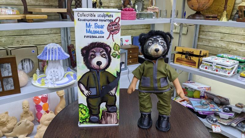 Коллекционная скульптура "Медведь". Изделие выполнено из древесного композита, ткани, железного каркаса и синтепона. Голова сделана из прессованного древесного композита, с ручной росписью. Тело сшито из х/б ткани, наполненное синтепоном. Одежда сшита из ткани - штаны, кофта. Обувь выполнена из заменителя кожи.