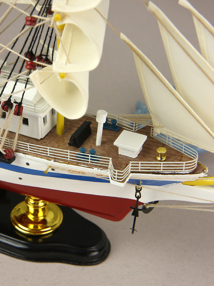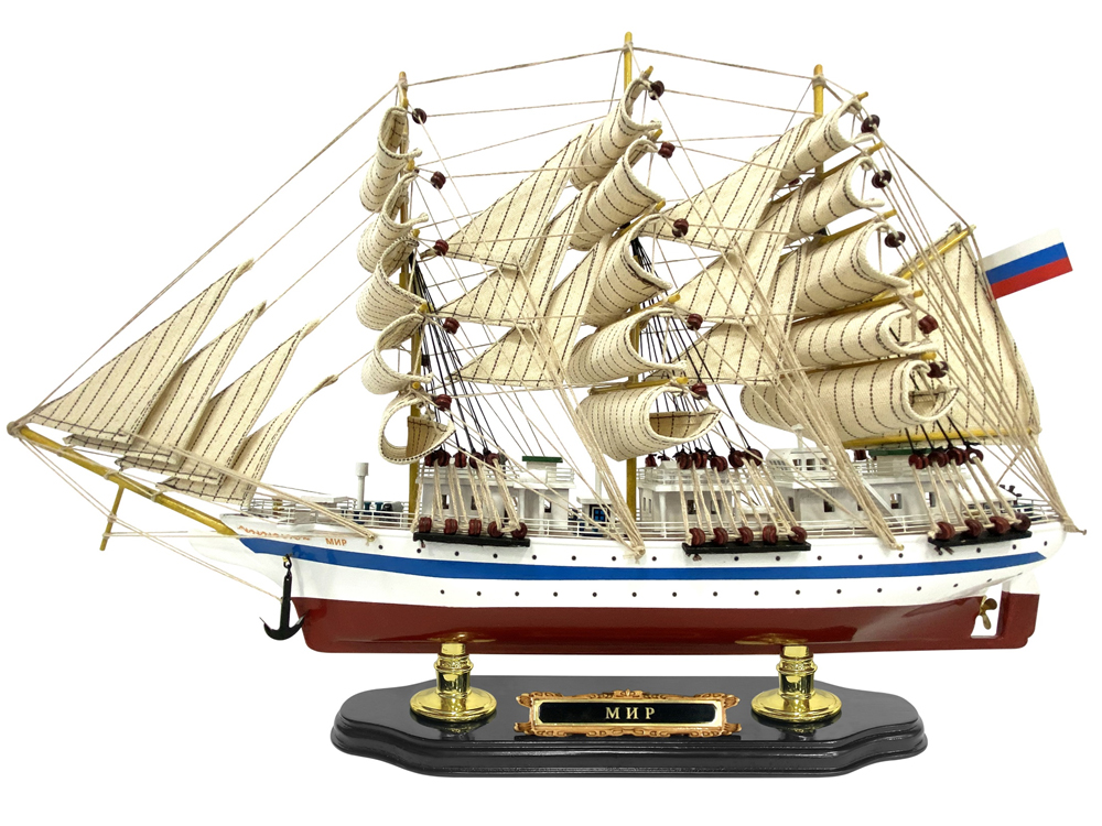 Красивая модель парусника "Мир". Корабль выполнен очень реалистично, он буквально повторяет каждую деталь своего прототипа. Каждый мужчина будет рад подобному подарку, он прекрасно украсит его кабинет либо гостиную, а также позволит немного расслабиться после работы, рассматривая его детали.