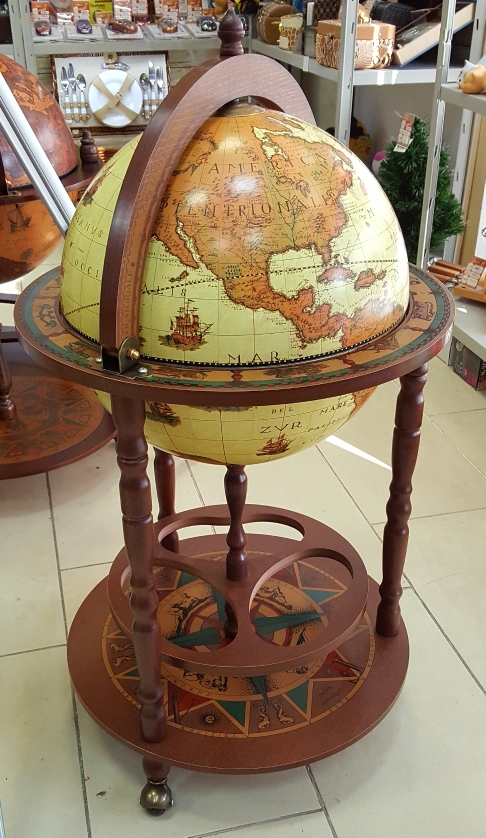 Один из самых популярных глобус-баров на нашем сайте. На сферу бара нанесена старинная карта 16 века. Отлично будет смотреться в любых по размеру помещениях, этот бар глобус придаст завершенности к классическому стилю дома. Выполнено изделие из твердых лиственных пород дерева. Один из немногих глобус-баров у которых сфера полностью вращается вокруг своей оси. Благодаря колесам его можно легко перемещать в пространстве помещения, не опасаясь за сохранность напитков. Оригинальный глобус-бар, который наполнит помещение духом прошедшего времени и создаст особую, теплую атмосферу. Даст возможность красиво хранить алкоголь всегда под рукой, что особенно важно, когда Вы ожидаете гостей.