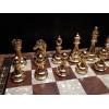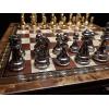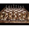 Подарочные шахматы из орехового дерева с бронзовыми литыми фигурами классической формы. Украшены инкрустацией натуральным перламутром и шпоном клена "птичий глаз" и шпоном ореха.