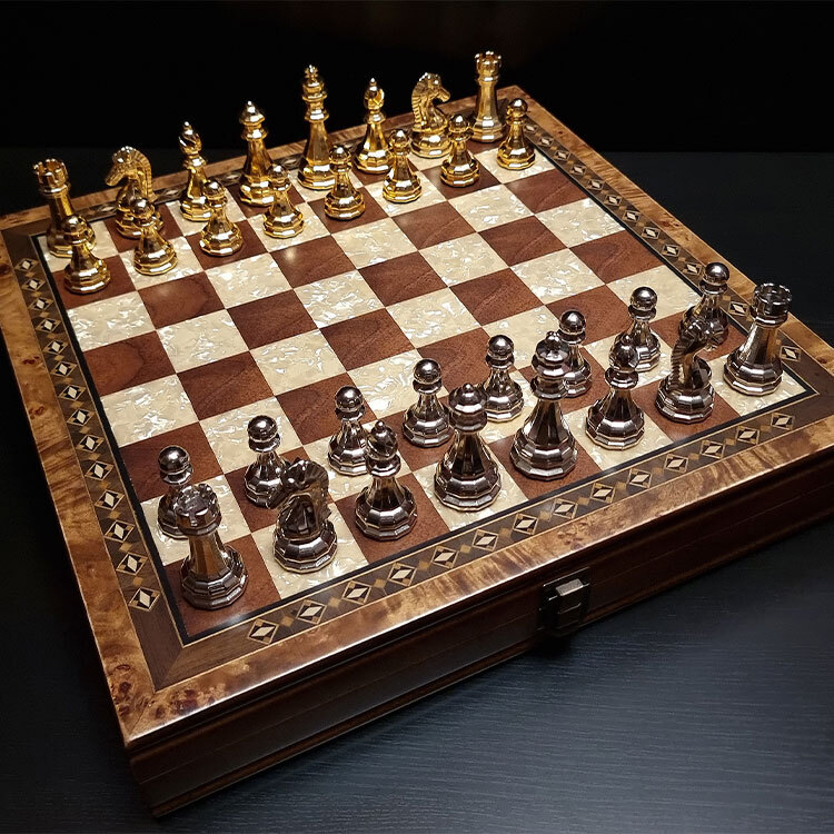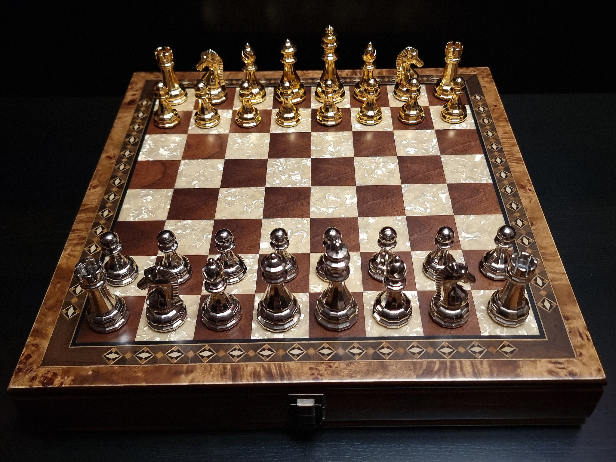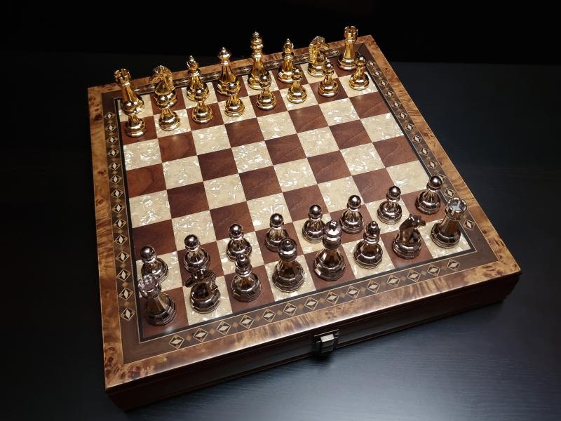 Подарочные шахматы из орехового дерева с бронзовыми литыми фигурами классической формы. Украшены инкрустацией натуральным перламутром и шпоном клена "птичий глаз" и шпоном ореха.