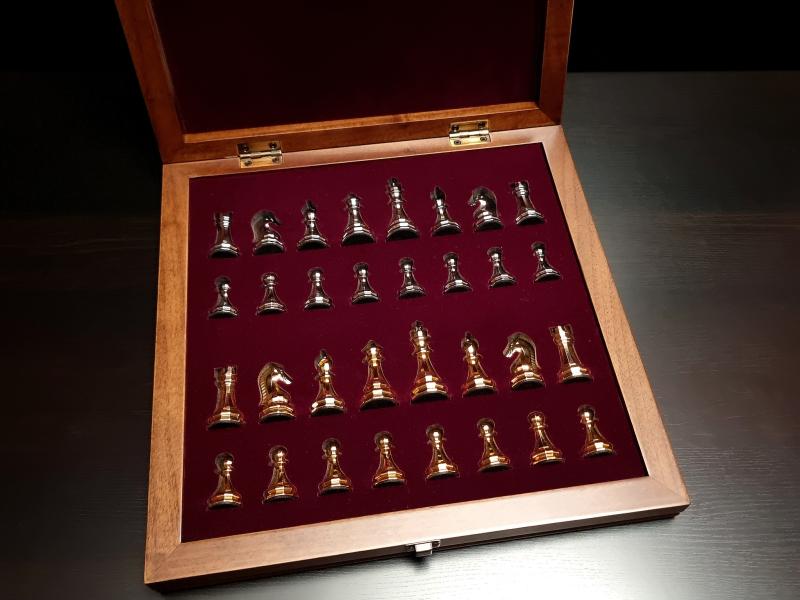 В комплект входят: доска-ларец, бронзовые фигуры (цвет - золото/серебро), сумка-чехол.