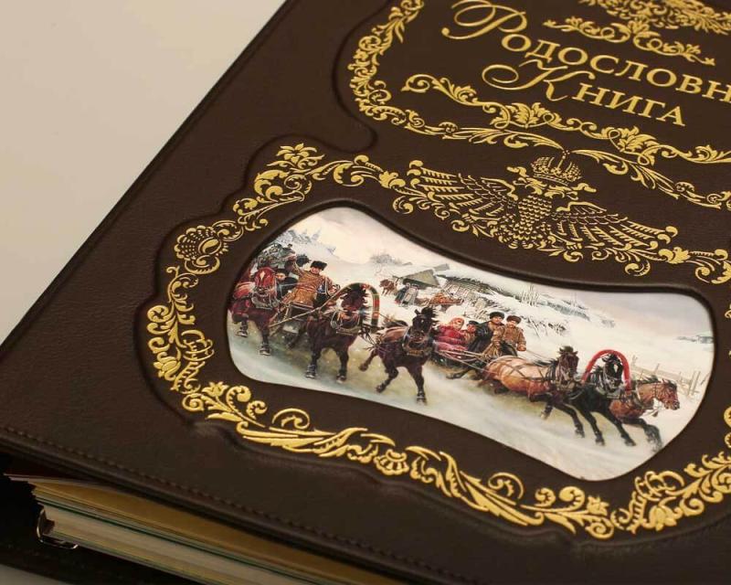 Обложка выполнена из финского картона обтянутого натуральной кожей. Тиснение золотом. Лицевая сторона книги украшена выпуклой вставкой и изображением русской тройки, которое меняется на ваше персональное заглавное фото обложки книги.