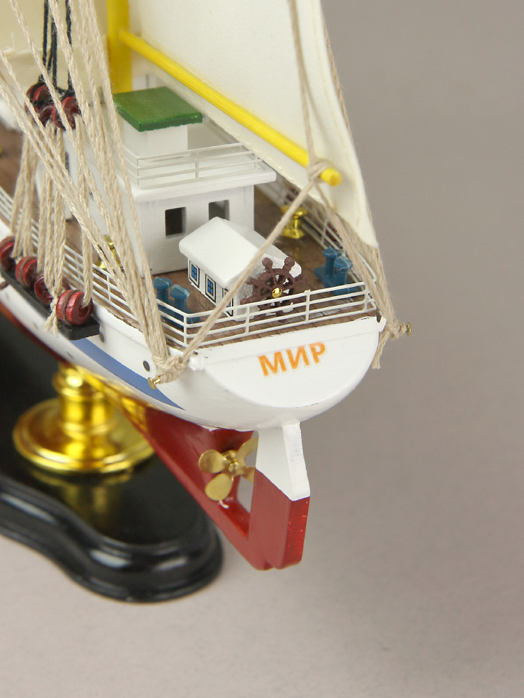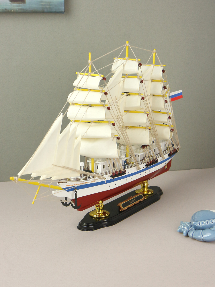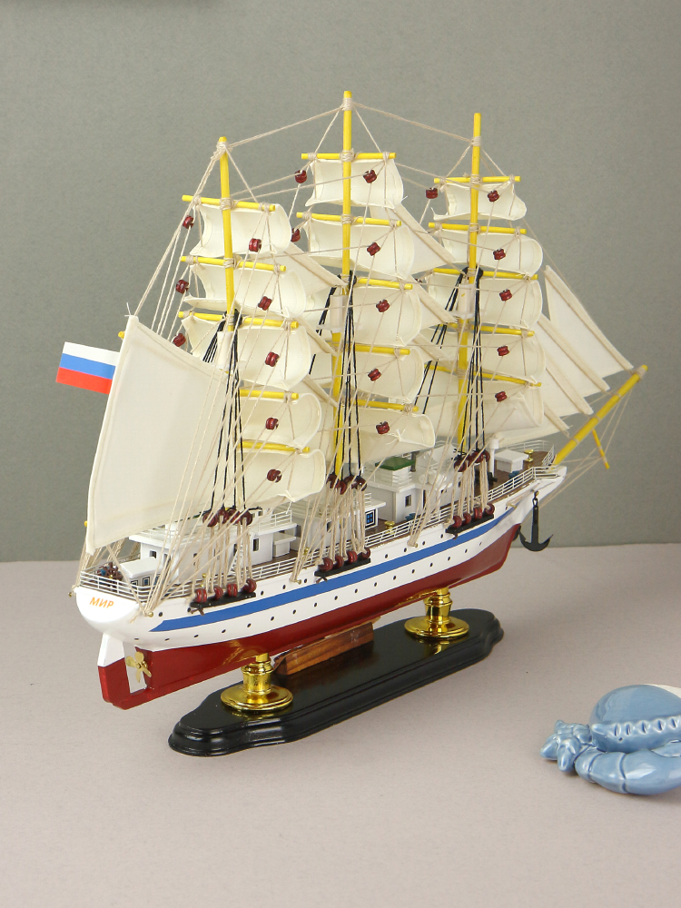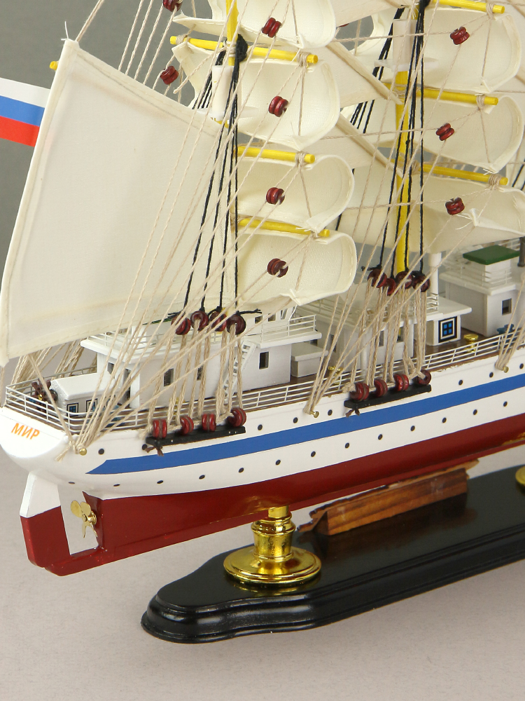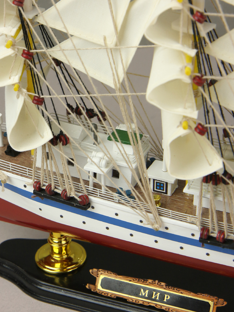 Красивая модель парусника "Мир". Корабль выполнен очень реалистично, он буквально повторяет каждую деталь своего прототипа. Каждый мужчина будет рад подобному подарку, он прекрасно украсит его кабинет либо гостиную, а также позволит немного расслабиться после работы, рассматривая его детали.
