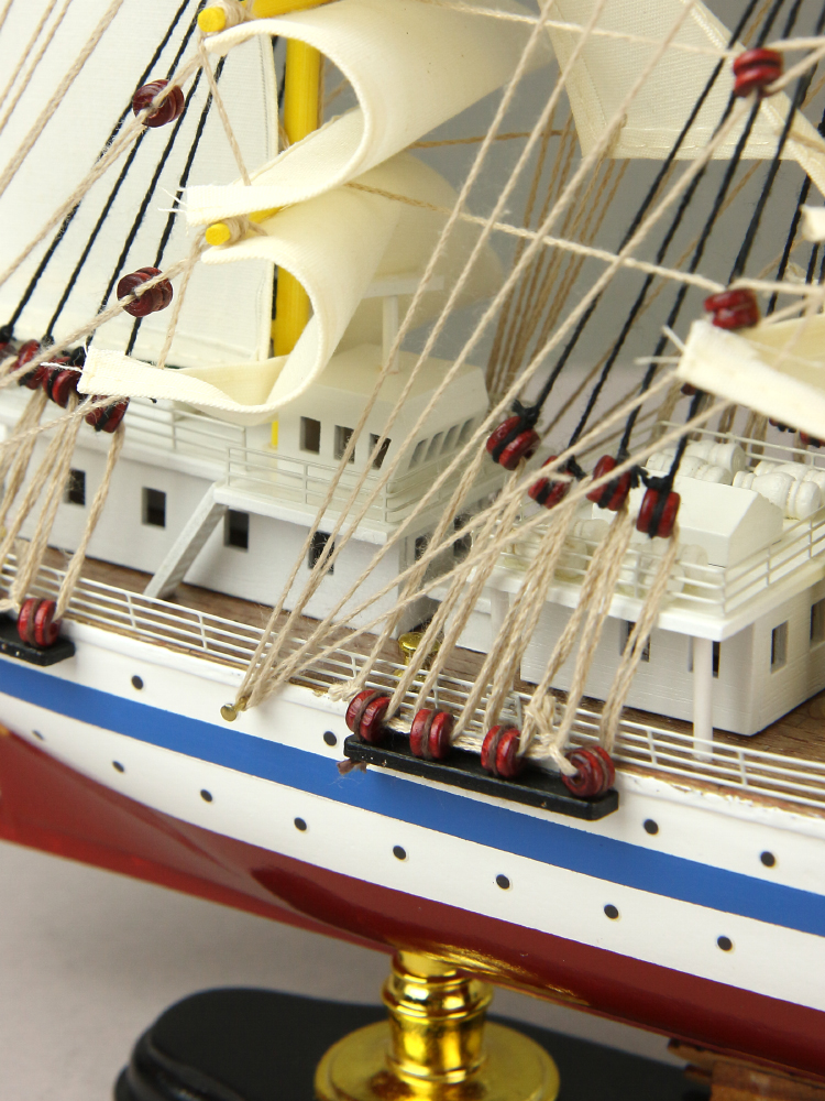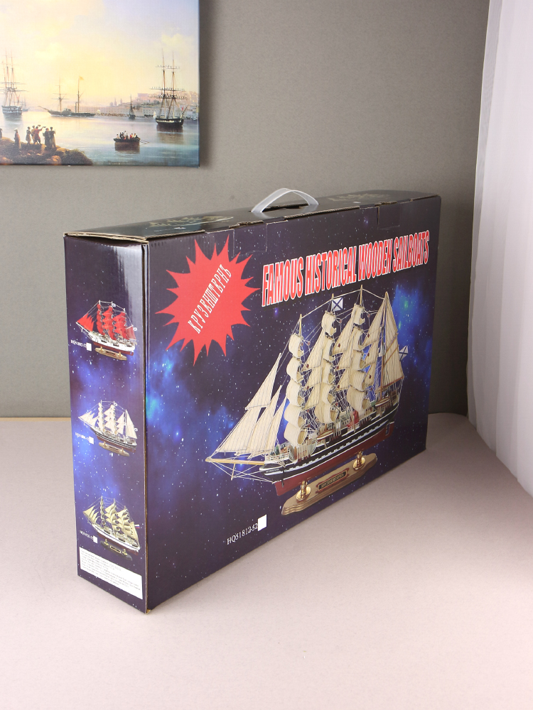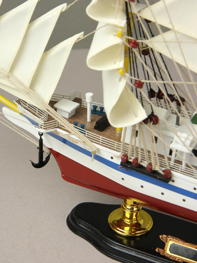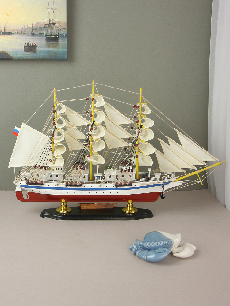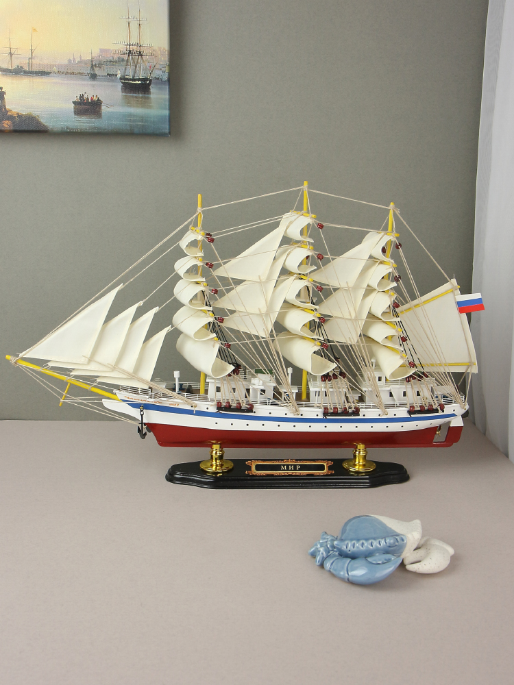 Красивая модель парусника "Мир". Корабль выполнен очень реалистично, он буквально повторяет каждую деталь своего прототипа. Каждый мужчина будет рад подобному подарку, он прекрасно украсит его кабинет либо гостиную, а также позволит немного расслабиться после работы, рассматривая его детали.