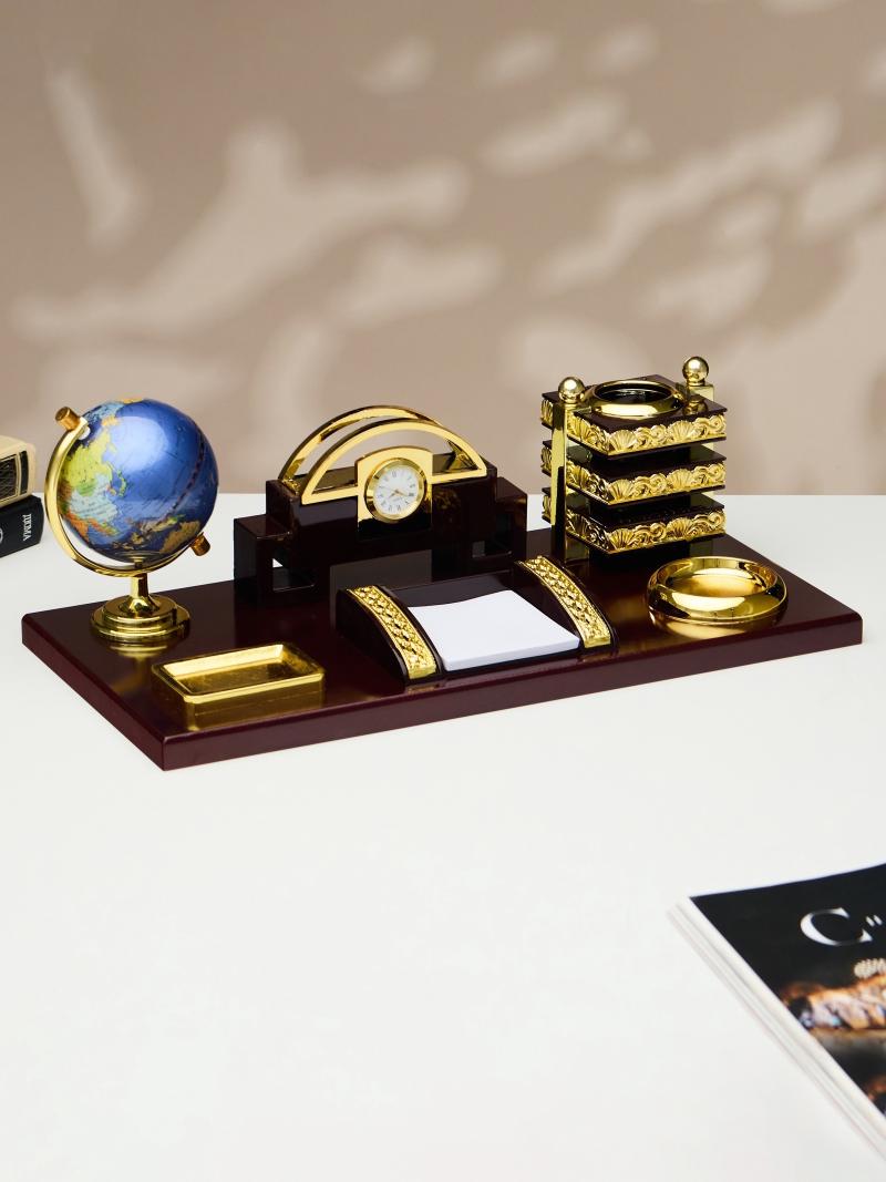 Компактный настольный набор поможет избежать хаоса на рабочем месте. Храните в нём канцелярские принадлежности или другие мелочи, чтобы правильно организовать пространство. К тому же изделие имеет минималистичный дизайн и выполнено под дерево, поэтому оно украсит собой любое место как декоративный элемент.